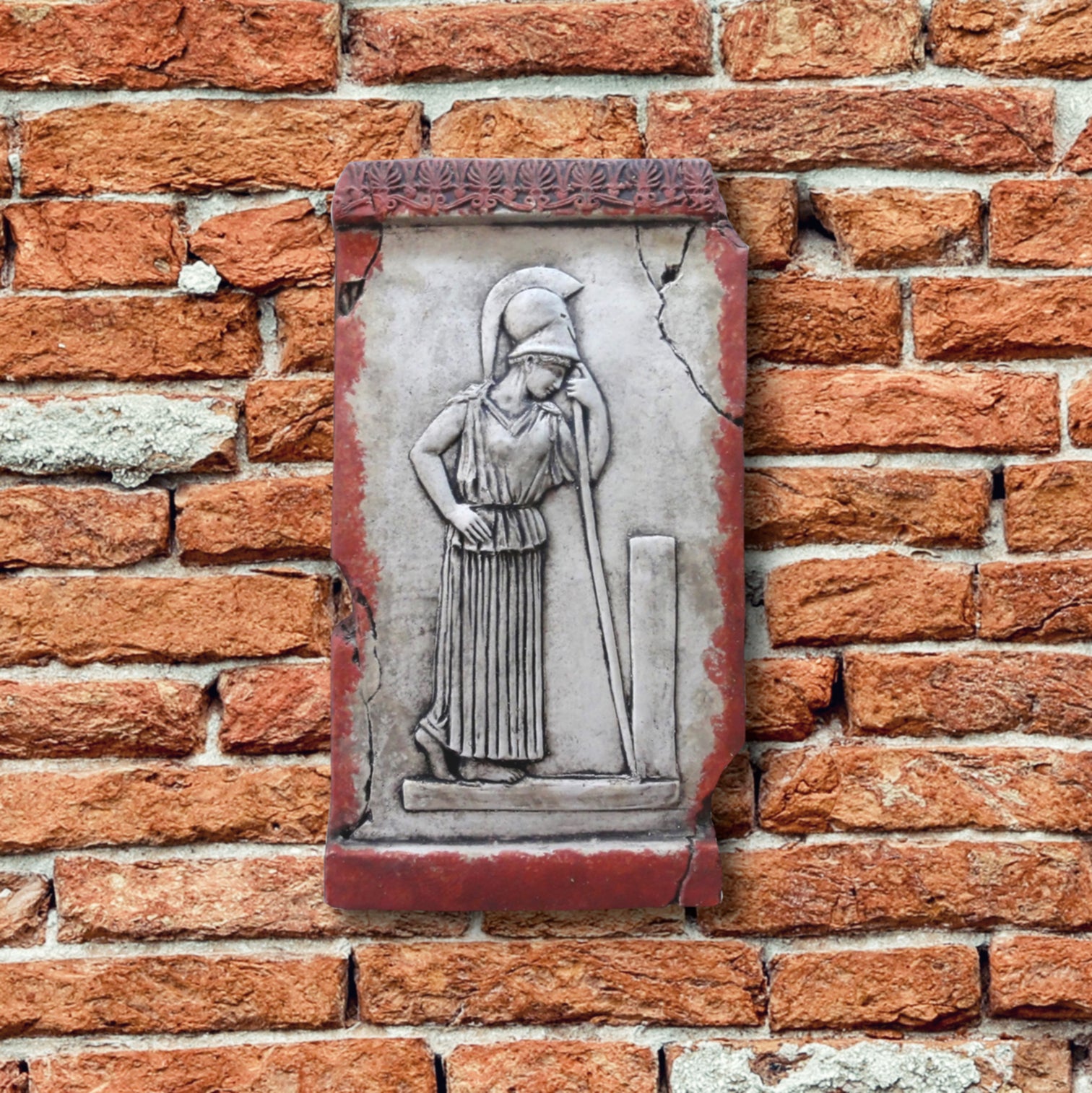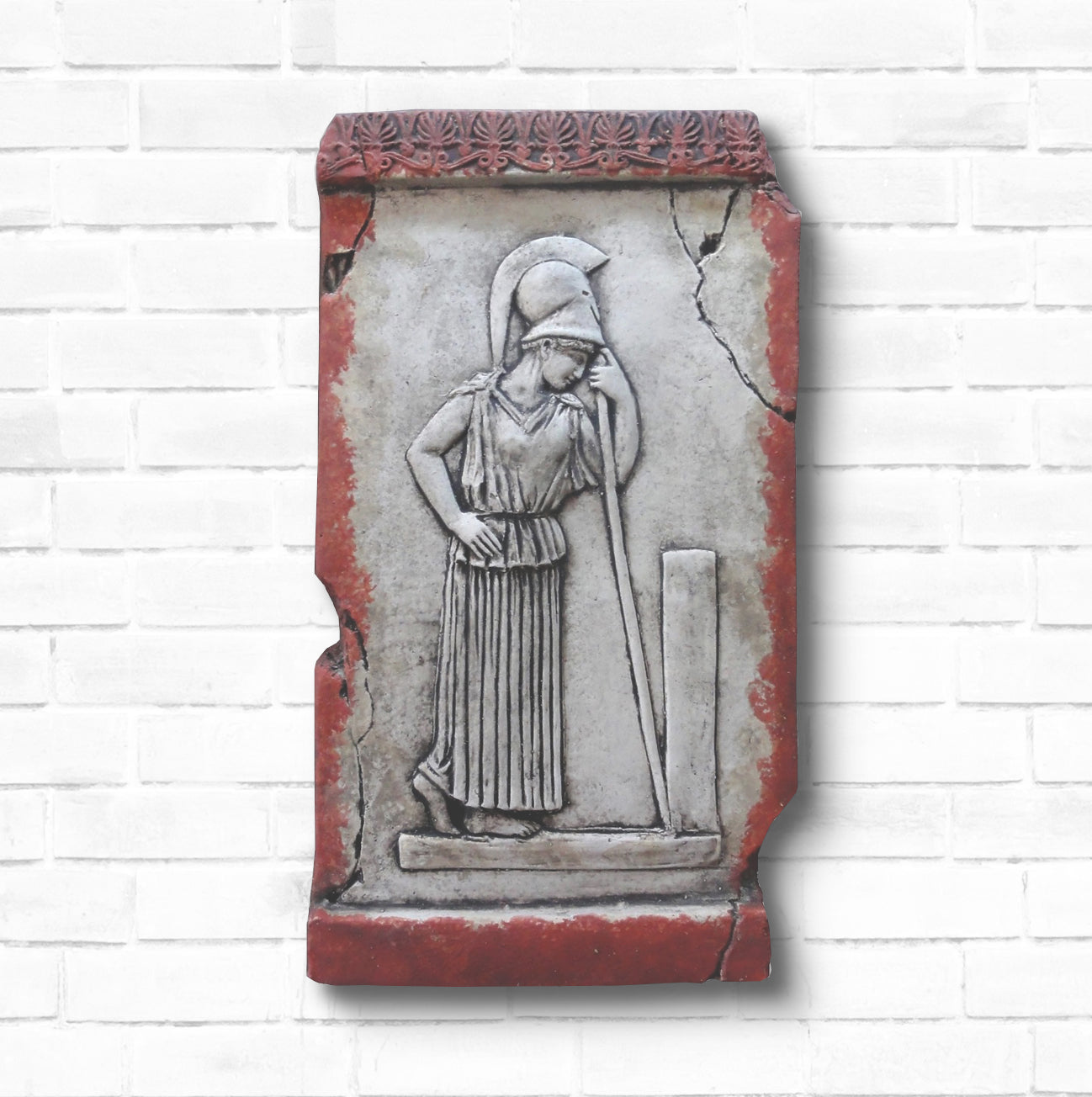 It is a free interpretation of a marble slab of the Akropolis of Athens, the "Mourning Athena" a masterpiece of the “severe style” (470–460 b. C. Athens, Akropolis Museum). The goddess, who wears a Corinthian helmet and stands barefoot, is leaning forward, on her spear, and bows her head. Her posture indicates a sad pensiveness, probably for the consequences of war, as the stone slab, the grave marker in front of Athena, probably indicates.