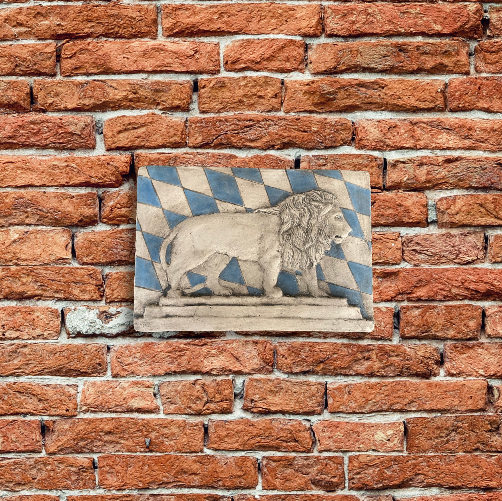 Beautifully handmade sculpture in terracotta. This bas-relief is inspired by one of the two impressive stone lions displayed in the Feldherrnhalle, Munich (Wilhelm von Rühmann, 1906). On the background we can see the Bavarian flag, with its characteristic  lozenges.